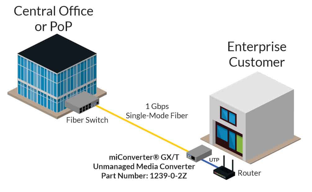 - At the enterprise edge, the miConverter GX/T receives the fiber connection and converts it to UTP copper.