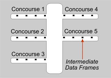 Fiber was distributed from the central internet Point of Presence at the network core to Intermediate Distribution Frames (IDF), or electrical network closets, throughout the airport. A PoE switch was installed in each IDF, and multiple Wi-Fi access points were connected to each switch. Each concourse has four IDFs, where gigabit network links were distributed from PoE switches in a hub and spoke topology. Depending on the location in the concourse, about half of the switches required a chassis of media converters to enable fiber connectivity to the access points.