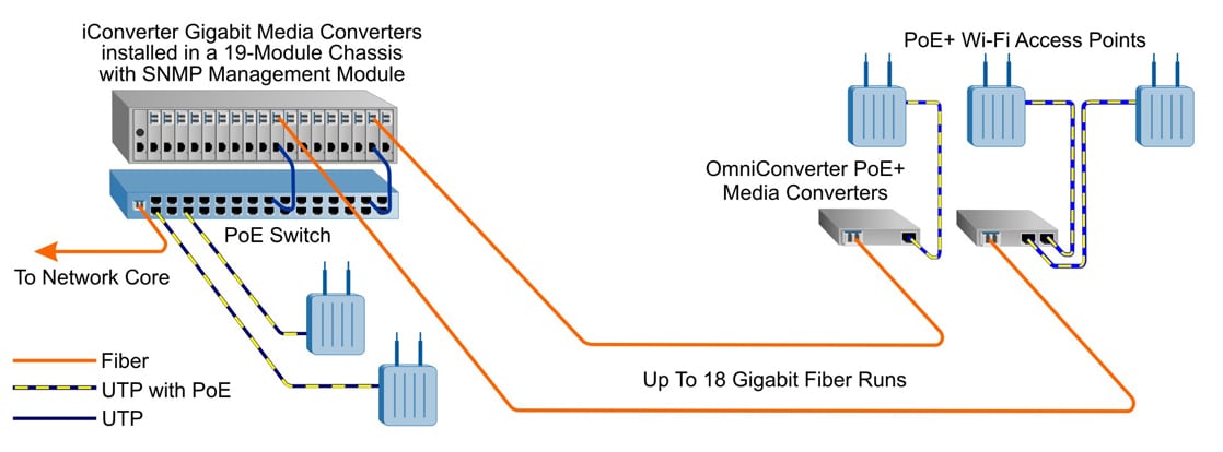 They selected Omnitron Systems’ iConverter media converters to provide high-density fiber distribution from the switches. iConverter gigabit media converters were installed in a 19-module chassis along with an SNMP management module. Up to 18 gigabit fiber runs were distributed from each switch to the access points.
