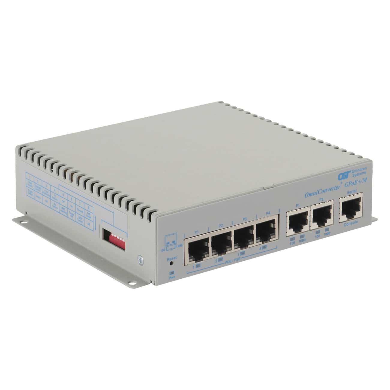 OmniConverter® GPoE+/M: 4 x 10/100/1Gbps RJ-45 PoE+ 30W to 2 x 10/100/1Gbps, RJ-45, No fiber, 100m, Managed Ethernet Switch, Standalone/Wall-Mount, JPN 100-240VAC, Commercial/Enterprise Temperature Range