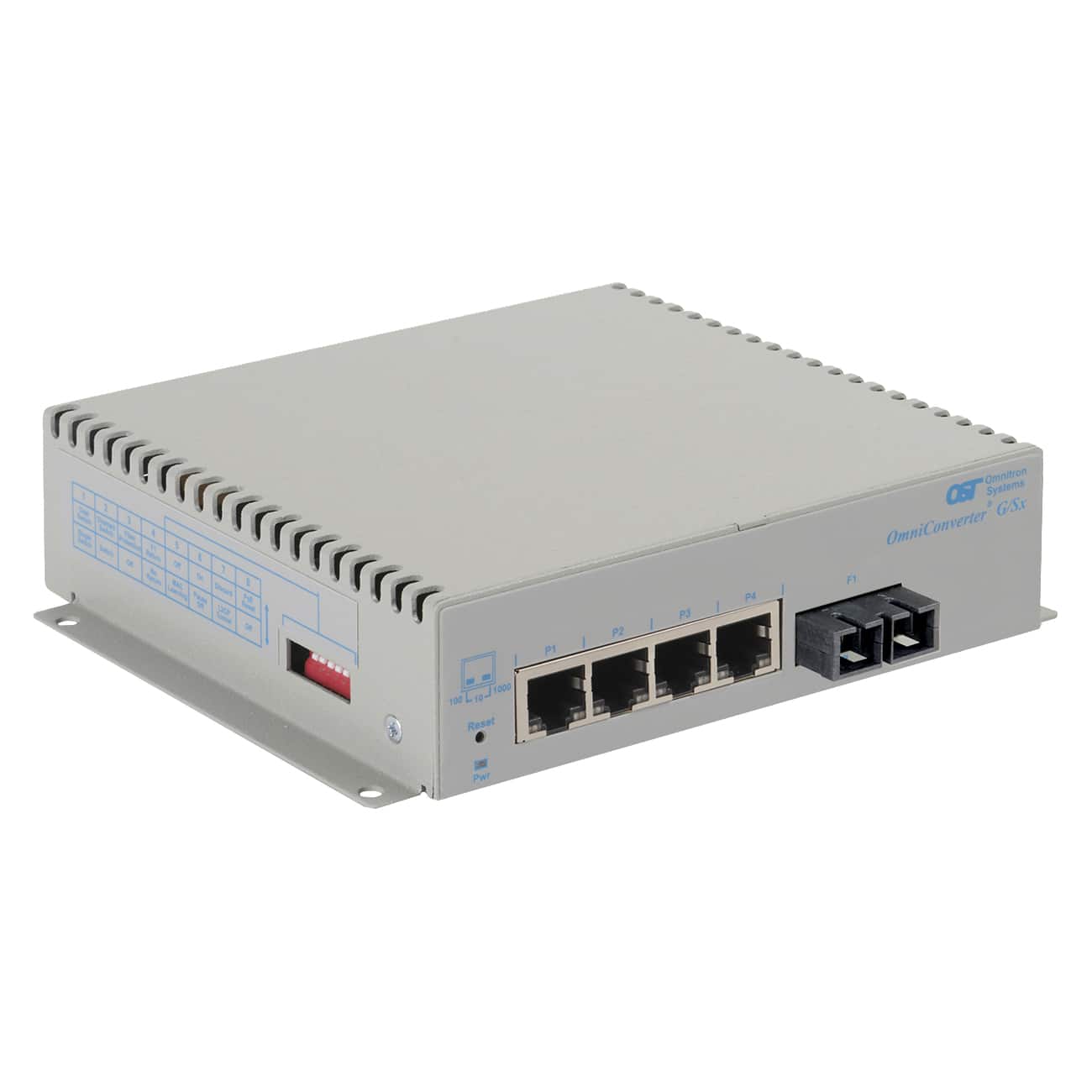 OmniConverter® G/Sx: 4 x 10/100/1Gbps RJ-45 No PoE to 1 x 1 Gbps, SC, MMDF, 850, 220/550m, Unmanaged Ethernet Switch, Standalone/Wall-Mount, US 100-240VAC, Commercial/Enterprise Temperature Range