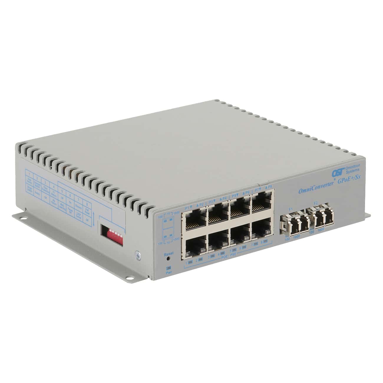 OmniConverter® GPoE+/SX: 8 x 10/100/1Gbps RJ-45 PoE+ 30W to 2 x 1 Gbps, LC, MMDF, 850, 220/550m, Unmanaged Ethernet Switch, Standalone/Wall-Mount, JPN 100-240VAC, Commercial/Enterprise Temperature Range