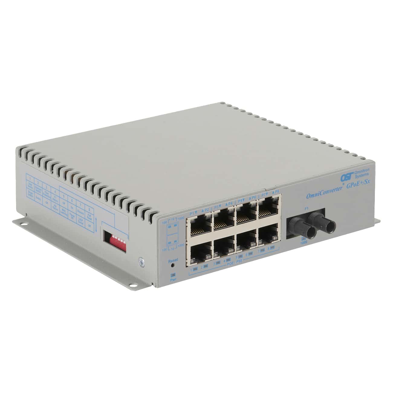 OmniConverter® GPoE+/SX: 8 x 10/100/1Gbps RJ-45 PoE+ 30W to 1 x 1 Gbps, ST, SMDF, 1310, 12km, Unmanaged Ethernet Switch, Standalone/Wall-Mount, DC 2-Pin Terminal, Extended Temperature Range
