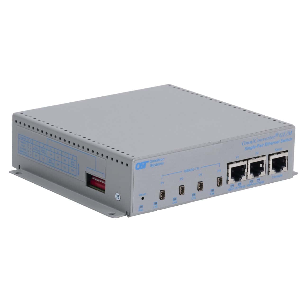 OmniConverter® SPE Managed Ethernet Switch GL/M - 2 x 10/100/1 Gbps RJ45 Uplink port, 4 x 10BASE-T1L IEC 63171-2 Connector user ports; Direct DC input, 2-pin terminal connector, no power adapter, with integrated mounting brackets; Commercial Temp (0 to 50 deg C)