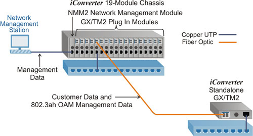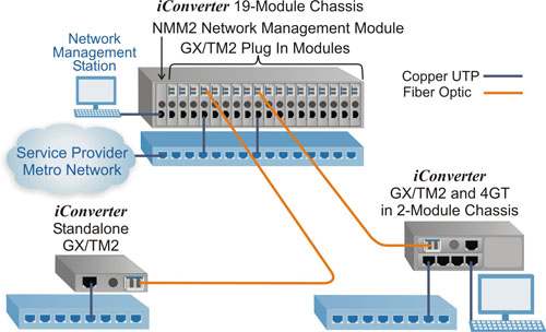 iConverter GX/TM2 plug-in modules are installed in a managed iConverter 19-Module chassis for high-density fiber distribution from UTP switch equipment. At Customer Premises on the right, a GX/TM2 plug-in module and an iConverter 4GT four-port switch module are installed in a 2-Module chassis, and share data via the Ethernet Backplane. This configuration provides a remotely managed demarcation switch with a fiber uplink port and five copper ports that drop off Ethernet services. At Customer Premises on the left, the GX/TM2 standalone NID provides a fiber uplink to a single copper port for intelligent demarcation of Ethernet services.