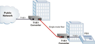 The iConverter T1/E1 media converter provides a cost-effective solution for extending telecom demarcation points. A pair of T1/E1 converters is used to extend the demarcation between buildings via fiber. Multimode or single-mode fiber can be used, and fiber links can be extended up to 60km using single-mode fiber.