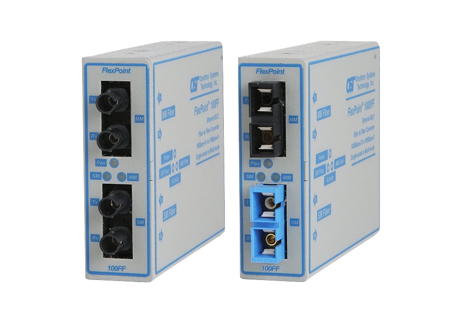 The FlexPoint 100FF is a Fast Ethernet fiber-to-fiber converter/transponder that provides reliable and cost-effective extension of network distances by connecting multimode fiber networks or devices over single-mode fiber cabling.