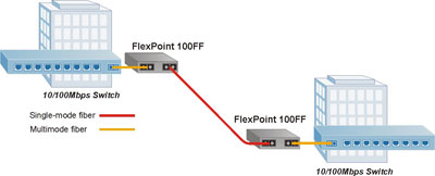 The FlexPoint 100FF fiber converter can extend the network across single-mode fiber with distances up to 120km. In this application, two 10/100Mbps Ethernet switches are connected utilizing a pair of FlexPoint 100FF fiber converters, which are connected to the switches via a multimode fiber uplink.