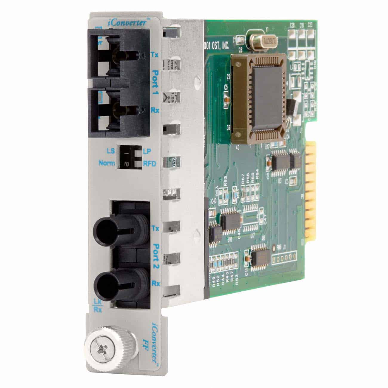 iConverter® OC3FF: OC-3/STM-1 to OC-3/STM-1, ST/SC, Multimode Dual Fiber / Single-Mode Dual Fiber, 1310nm/1310nm, 5km/30km, Powered by Chassis, Commercial Temperature 0 to 50 deg C