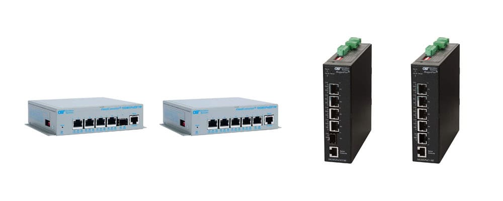 They can be shelf, wall, and DIN rail mounted. OmniConverter switches are available in Commercial (0° to 50°C), Wide (-40° to 60°C) and Extended (-40° to 75°C) operating temperature range models. The RuggedNet switches all operate in the Extended (-40° to 75°C) temperature range and have an IP40 rated metal housing and DIN-Rail brackets included.