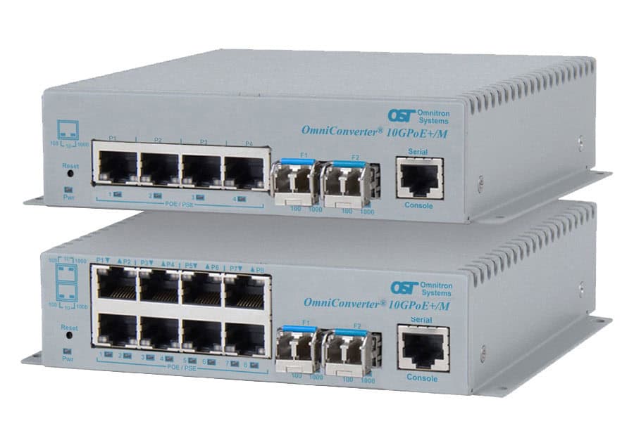 The OmniConverter 10GPoE+/M is a compact managed PoE and PoE+ Ethernet switch that feature two 1/10G uplink ports and four or eight 10/100/1000 PoE/PoE+ RJ-45 copper user ports.