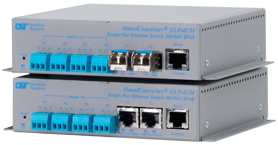 The OmniConverter GLPoE/M is a managed Single Pair Power over Ethernet (SPoE) switch that is IEEE 802.3cg compliant and features copper or fiber uplink ports and four single-pair 10BASE-T1L copper SPoE user ports.