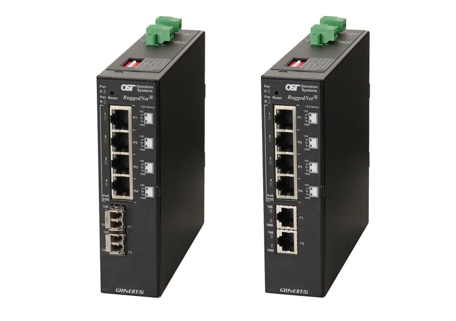 The RuggedNet GHPoEBT/Si is an unmanaged Industrial Ethernet switch that features two 1/10G uplink ports and four 10/100/1000 RJ-45 IEEE 802.3bt 60W or 100W PoE user ports.