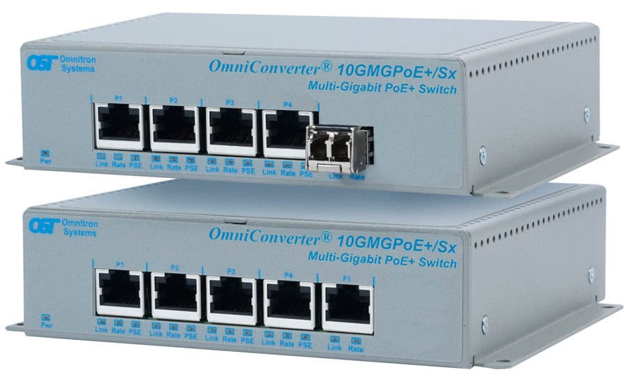 The OmniConverter 10GMGPoEBT/Sx switches provide up to 100 watts and speeds up to 10Gbps on the RJ-45 user ports.