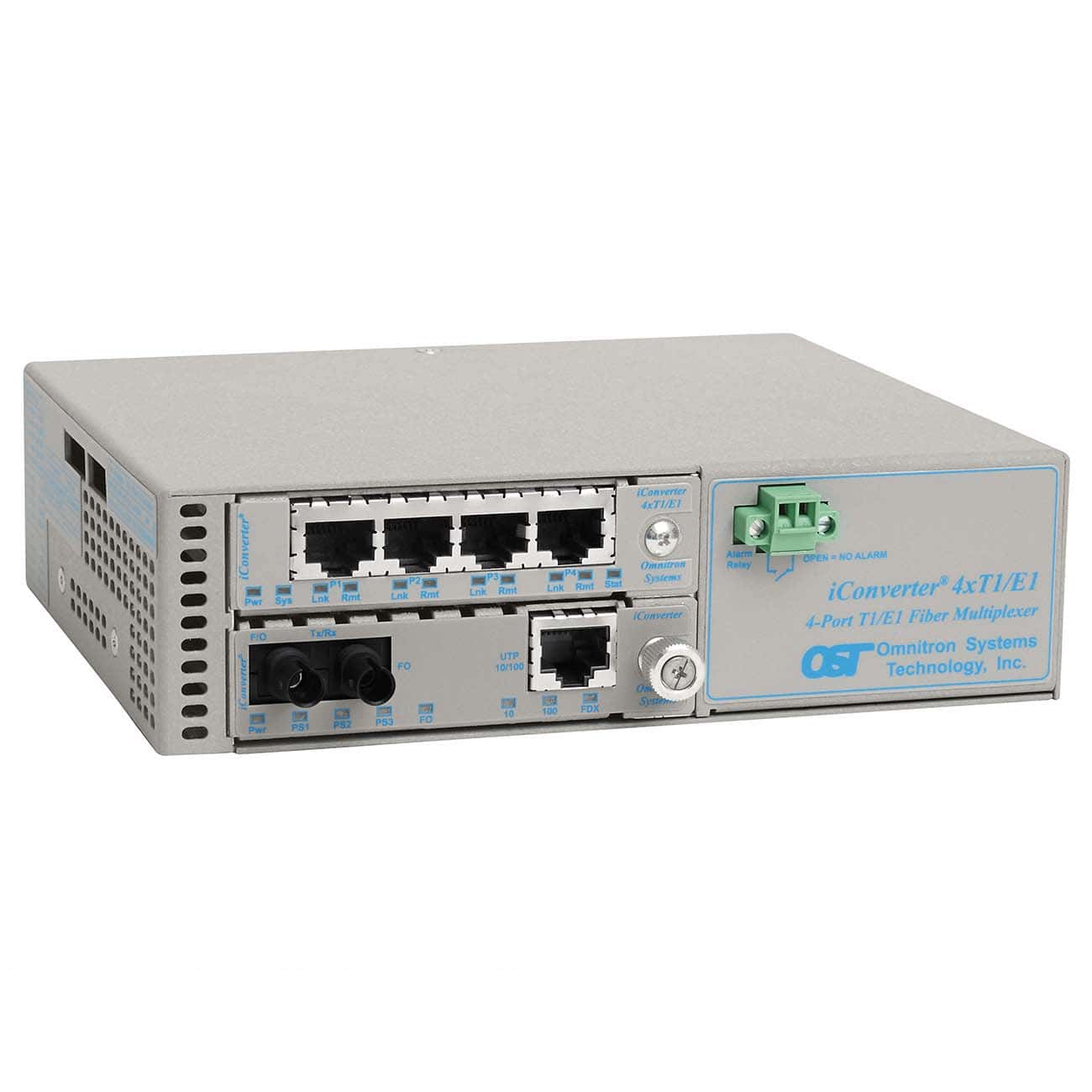 iConverter® T1/E1 MUX: 4 x RJ-48 with 10/100 RJ-45 Unmanaged Multiplexer, Standalone/Rack Mount, ST, 1310nm, SM/DF, 60km, 1 x US 100-240VAC, Wide